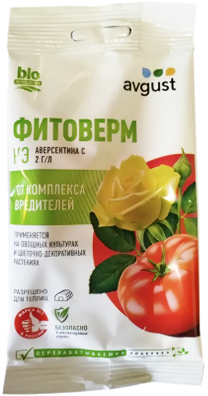 «Fitoverm» on laajavaikutteinen: yli 20 tuhohyönteislajia vastaan, mukaan lukien koloradonkuoriainen, kaaliperhonen, kaaliyökkönen, vihannespunkki, omenakääriäinen, kärsäkkäät, ripsiäiset ja kaikki kirvalajit.