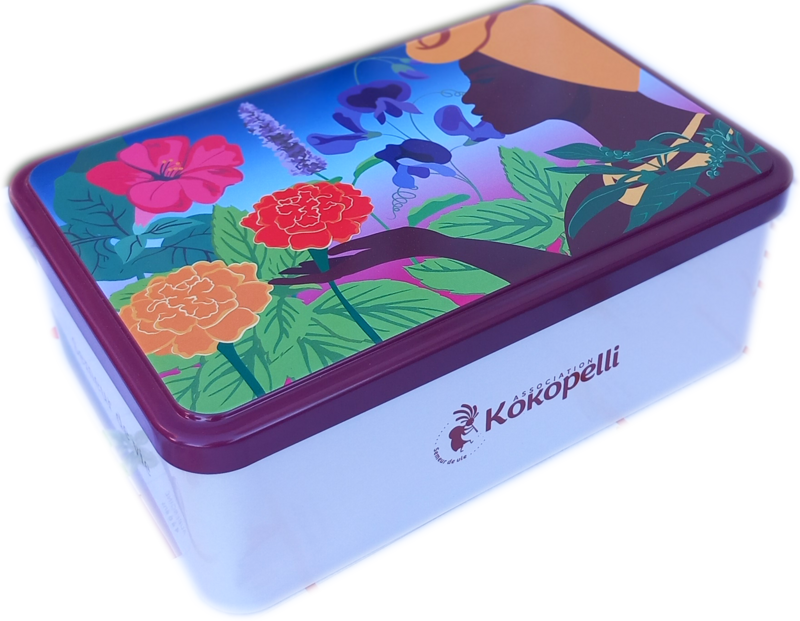 Комплект семян аккуратно уложен в иллюстрированную металлическую коробку, идеально подходящую для хранения пакетиков с семенами.