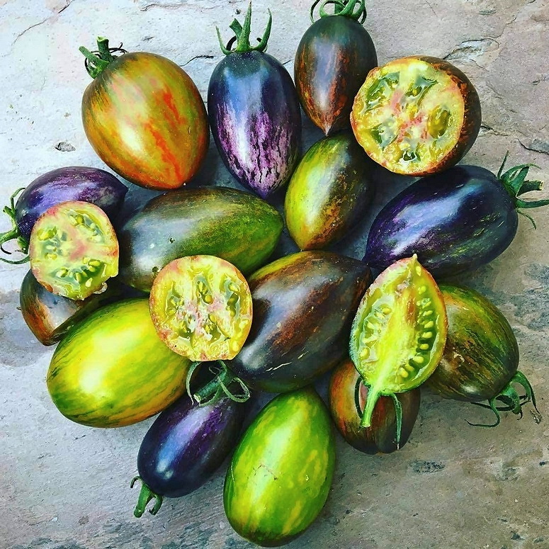 Этот ослепительный, энергичный и сверхпродуктивный сорт дарит нежные, сладкие, слегка вытянутые и заострённые на конце плоды. Их пёстрая шкурка расписана зелёными и фиолетовыми штрихами, которые при полной ботанической зрелости трансформируются в насыщенный красновато-коричневый (ржавый) цвет с глубокими индиговыми (антоциановыми) мазками.